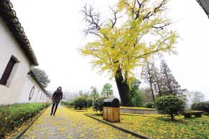 A visitor walks past an 800-year-old ginkgo tree in Sanshi village, Fuqiao town, on Nov 23. [Photo from Taicang Daily] |