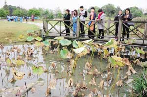 A group of tourists from Shanghai and Zhejiang admire the remaining lotus plants at Yuanhuayuan Villa (园花园山庄) in Taoyuan village, Liuhe town, on Nov 22. [Photo from Taicang Daily] |