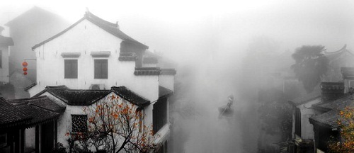 Fog rolls into Shaxi partially shrouding old river houses in Taicang, Jiangsu province. [Photo/Wechat: tcfbgw] |