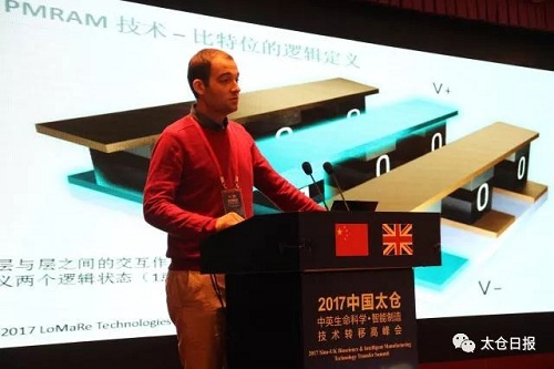 Evgeniy Donche, a PhD in nano materials from Imperial College London, introduced a new type of RAM storage technology at the China-UK Technology Transfer Summit. [Photo/WeChat account: taicangdaily] |